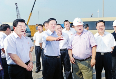 圖為劉奇葆(前中)一行在王建軍、侯曉春等的陪同下,在香港玖源化工建設(shè)現(xiàn)場(chǎng)調(diào)研。
